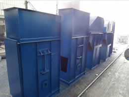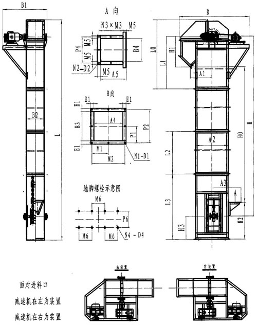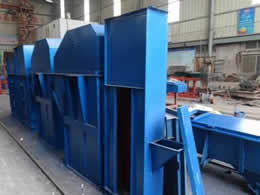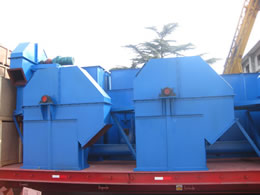 料斗把物料從下面的儲藏中舀起,隨著輸送帶或鏈提升到頂部,繞過頂輪后向下翻轉(zhuǎn), 斗式提升機將物料傾入接受槽內(nèi)。帶傳動的斗式提升機的傳動帶一般采用橡膠帶,裝在下或上面的傳動滾筒和上下面的改向滾筒上。鏈傳動的斗式提升機一般裝有兩條平行的傳動鏈,上或下面有一對傳動鏈輪,下或上面是一對改向鏈輪。斗式提升機一般都裝有機殼,以防止斗式提升機中粉塵飛揚。
