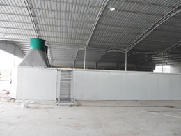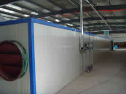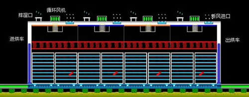 該干燥設(shè)備采用的是連續(xù)性烘干作業(yè),主要有干燥室、烘干車、料盤、供風系統(tǒng)、熱風爐、自動電控系統(tǒng)等構(gòu)成。干燥室采用金屬保溫板或磚混結(jié)構(gòu),烘干盤采用金屬或其他材料制作。