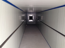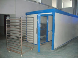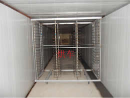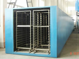 將待干燥的物料置于烘盤中,烘盤置于烘干車上,烘干車從干燥室入口依次進入,與此同時,熱風由供風系統(tǒng)從干燥室出干料端送入,與烘干車運行逆向,與物料進行充分的接觸。干燥室自動控溫,濕氣由排濕風機自動排出。