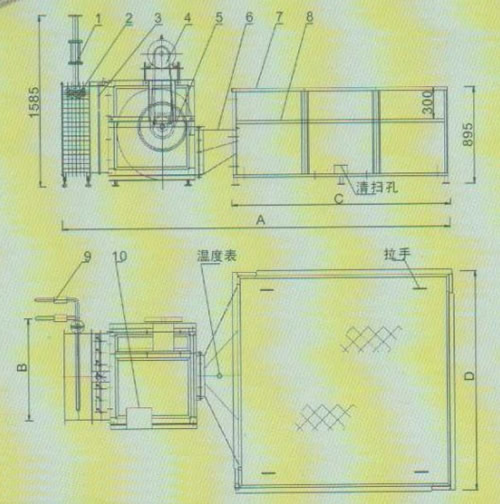 | 型號 | 風(fēng)量(m3/h) | 功率(Kw) | 蒸汽耗量(kg/h) | 散熱器面積(m2) | 干燥能力(KgH2O/h) | 外形尺寸(長寬高)MM |
